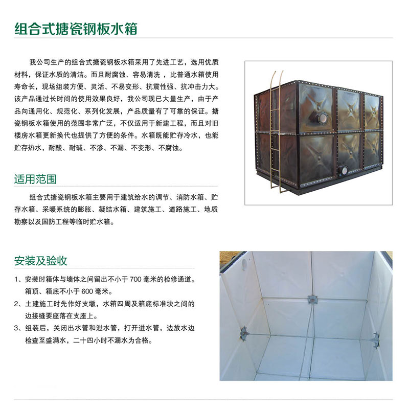名稱:搪瓷水箱 公司:山東晴朗空調科技有限公司 品牌:晴朗空調 類型:搪瓷水箱 型號:定制訂做 電話:18605341118 搪瓷水箱,搪瓷水箱、不銹鋼水箱、鍍鋅水箱、人防水箱等產品。高強搪瓷鋼板水箱是采用HSC系列瓷釉作為底釉和面釉涂搪在δ2-δ5鋼板上,板塊經燒制后組裝而成的一種新型水箱。其瓷 咨詢價格產品中心返回上頁